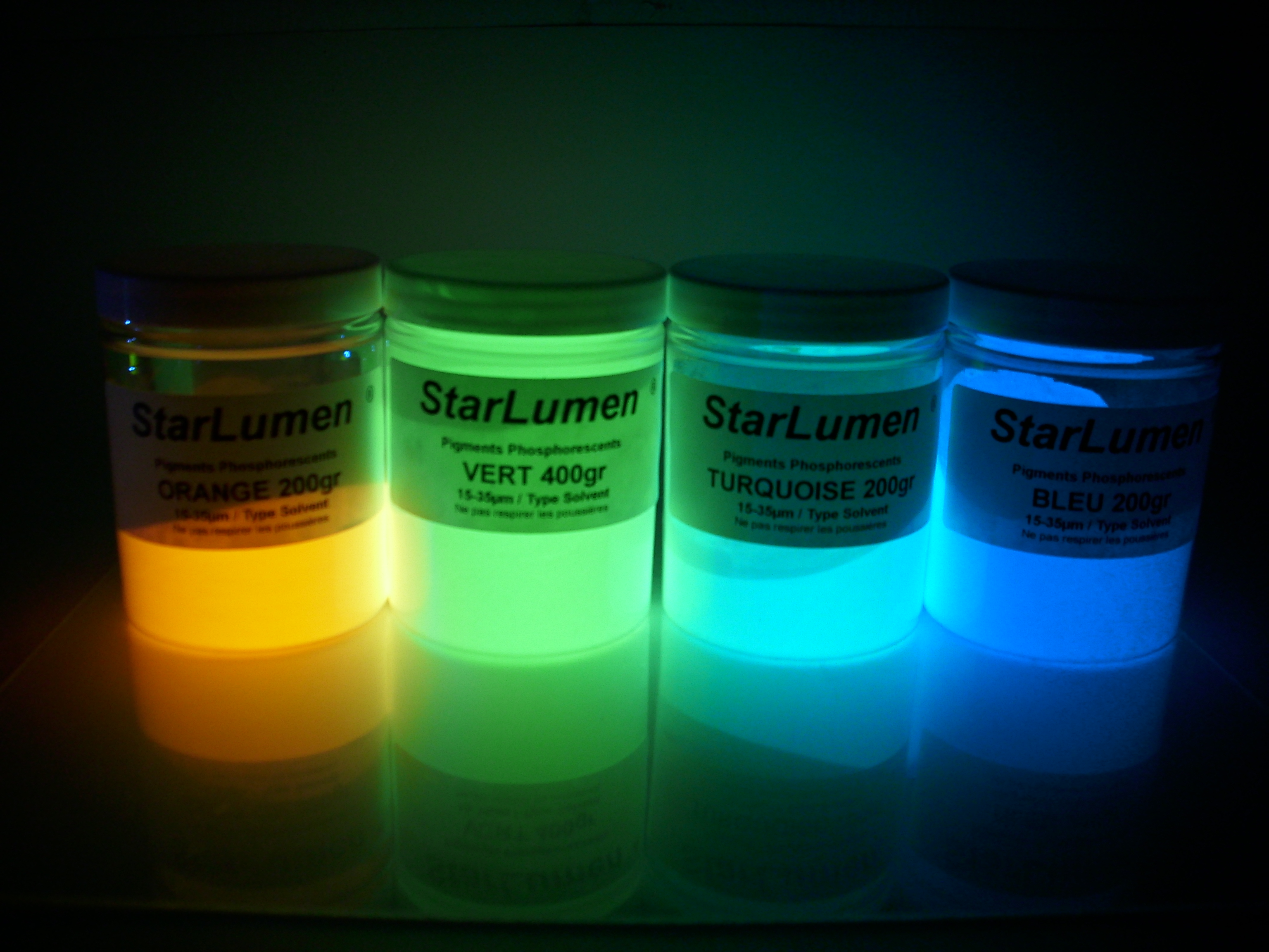 O pó fosforescente é um aditivo de tipo pigmento que permite dar uma propriedade naturalmente luminescente na escuridão a todos os materiais transparentes: os agents ligantes, vernizes, resinas, plásticos, vidros,