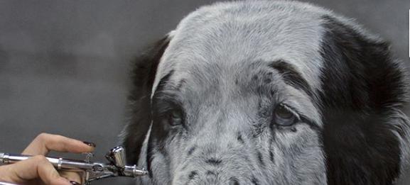 Exemplo: o desenho dum animal usando o aerógrafo, com um fundo preto e uma pelagem realizada com branco opaco de Schmincke. Poderemos usar todas as cores transparentes da gama Candy AeroColor, uma vez o desenho a preto e branco acabado.