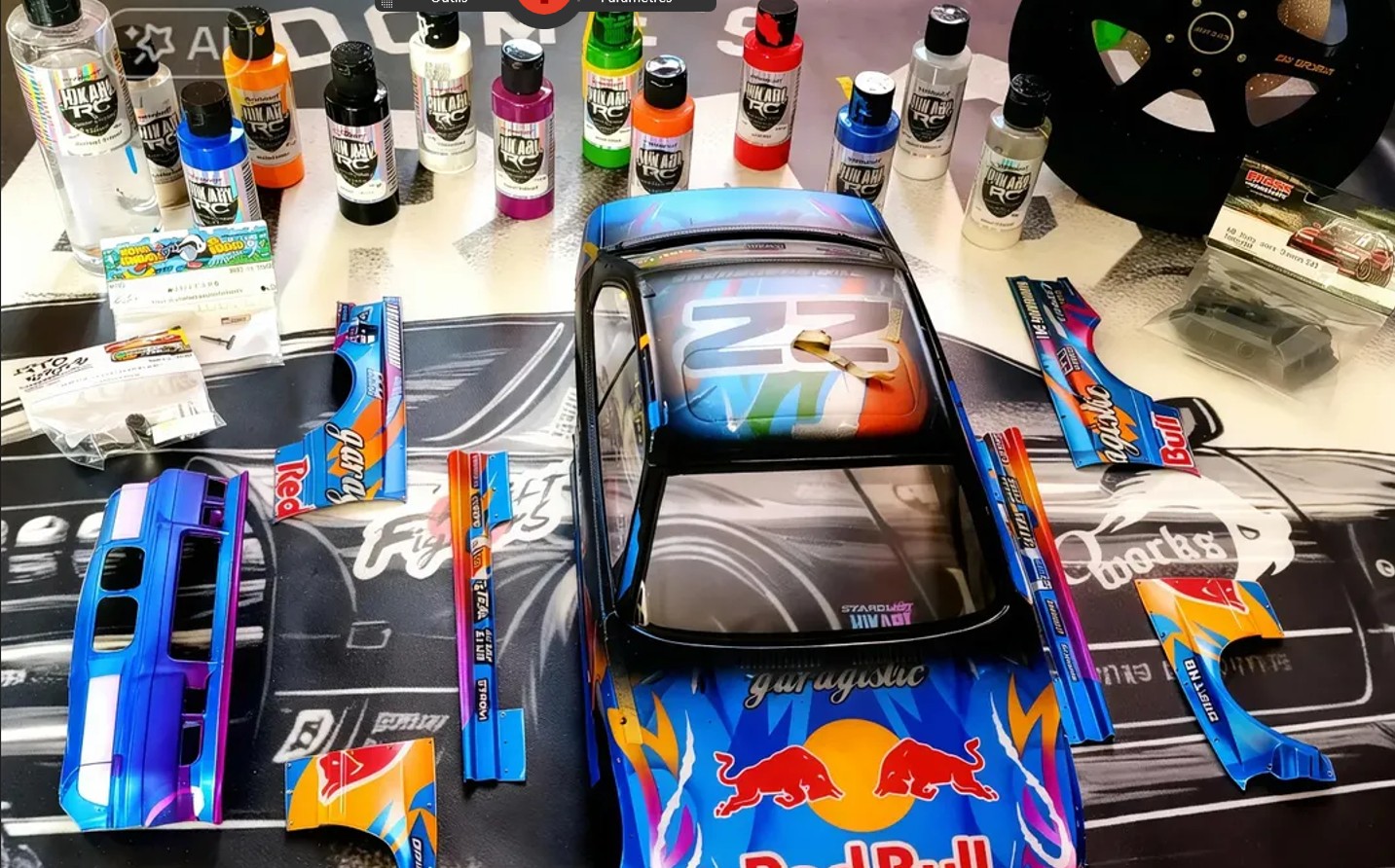 Na arte da decoração sobre um veículo com controle remoto e carenagens em Lexan, sobrepõem-se tintas, efeitos e cores. Nesta categoria artística, as diferentes etapas são realizadas na ordem contrária, no interior da carenagem transparente.