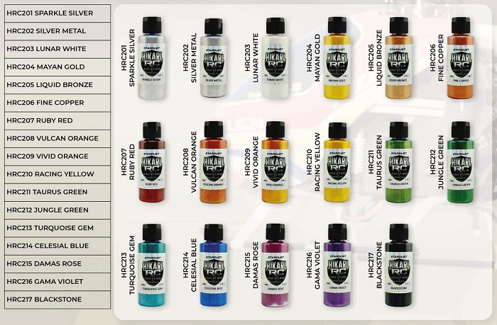 As tintas para modelos com controle remoto Hikari® CR incluem uma série de cores peroladas e metalizadas à base de água para decorar os veículos telecomandados.