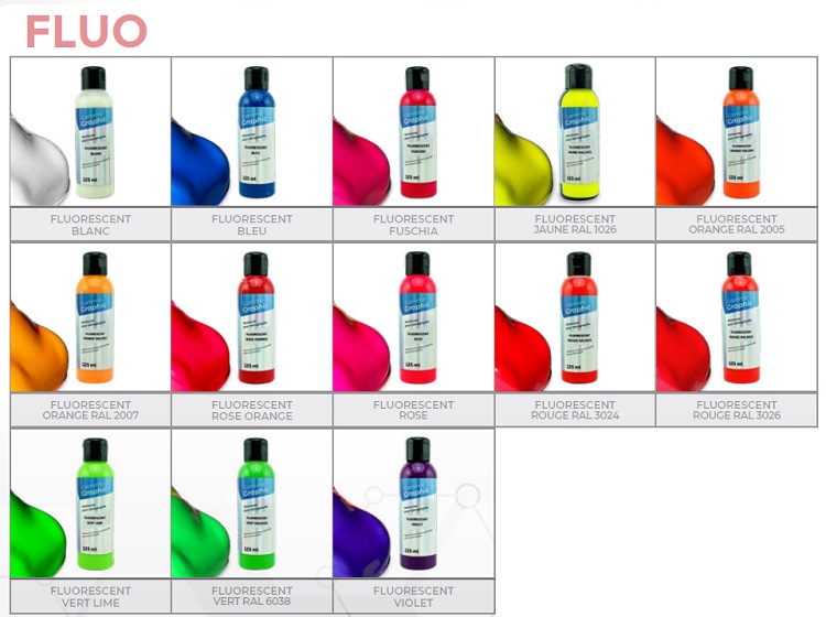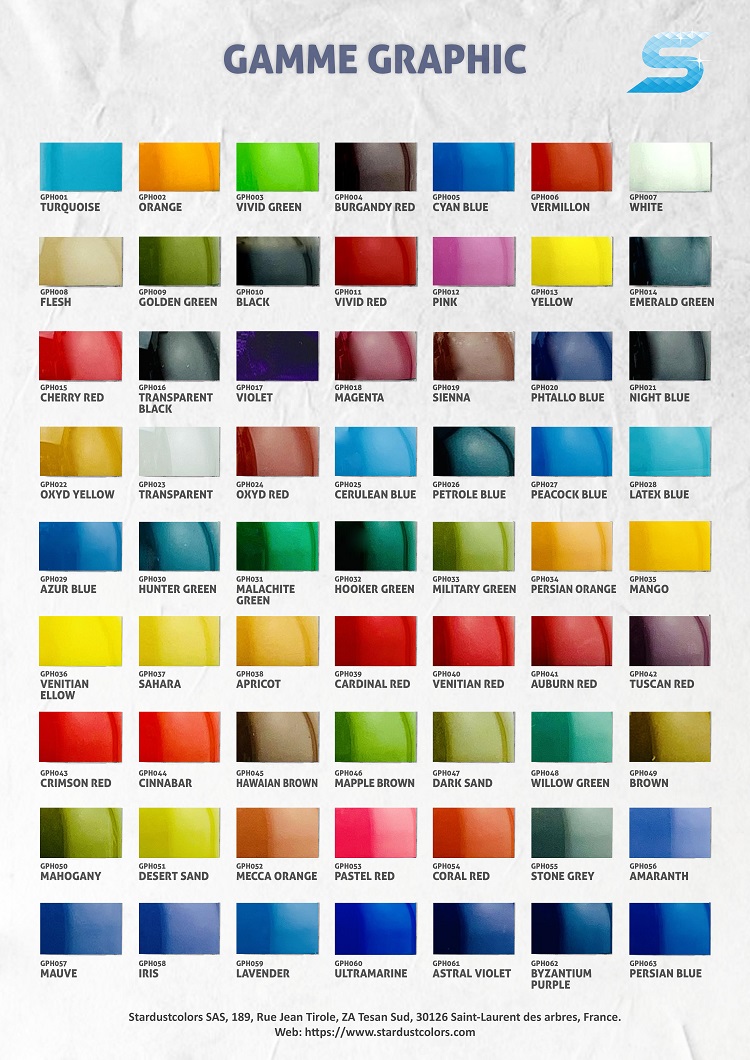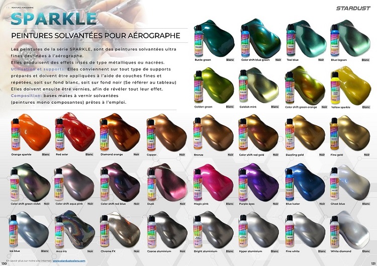 As Graphic são cores "planas", enquanto que as Sparkle são cores com partículas metálicas ou peroladas. As tintas fluo são tintas extremamente fortes e luminosas, muito apreciadas na área da moto.
