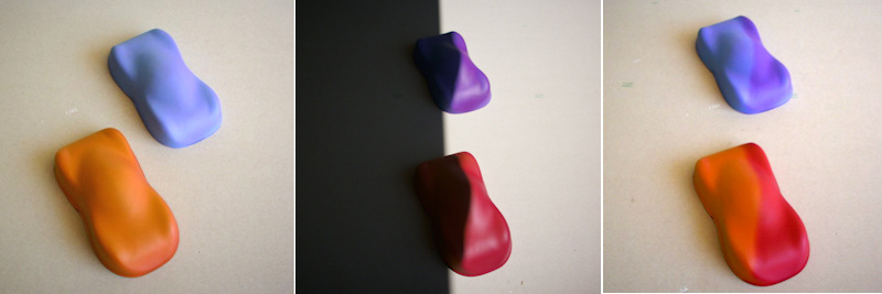 Exemplo de uso : Como é semi-transparente, a tinta fotocrômica deixa aparecer a cor do fundo quando o suporte está na sombra e a tinta inativa : Num fundo branco, a tinta fotocrômica laranja mudará de branco para laranja quando exposta ao sol. Por outro lado, se aplicarmos a fotocrômica vermelha num fundo amarelo, obteremos um resultado final amarelo na sombre e vermelho/laranja no sol. Da mesma forma, se for aplicada num primer amarelo, uma tinta fotocrômica azul aparecerá verde ao sol. Aplicada num primer azul, a tinta fotocrômica vermelha irá aparecer roxa ao sol.